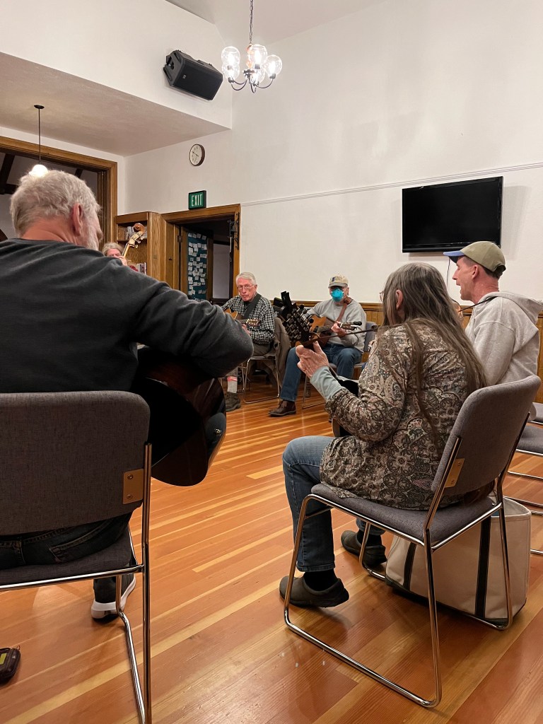 To the non-musically trained ear, the All Souls Unitarian Church bluegrass jam sounds like a professional quality show. The musicians are on key, in synchronized rhythm and taking turns sharing leads or “taking breaks”. People are singing in harmony and no one seems to be hogging the spotlight or messing up (too much). One might even think, “it must be rehearsed!” Despite sounding like a professional group, the jam is almost completely improvised. On any given bluegrass jam, one will never know who might show up and what songs from the “bluegrass canon” could be sung. The jam is spontaneous yet open, as long as you can understand its rules and your place.